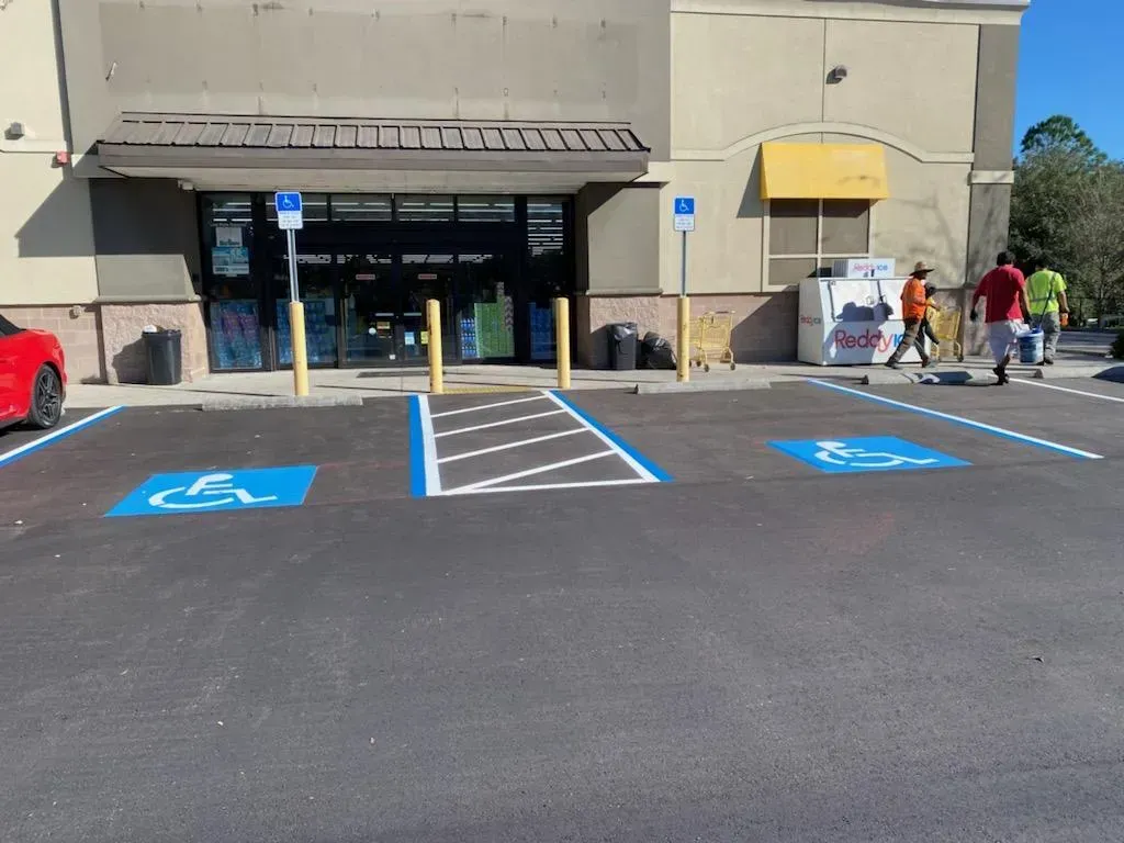 Clear, professional striping improves traffic flow and pedestrian safety while maximizing your lot's parking capacity. We also ensure your lot meets ADA (Americans with Disabilities Act) requirements, including proper markings for accessible parking spaces, ramps, and signage.